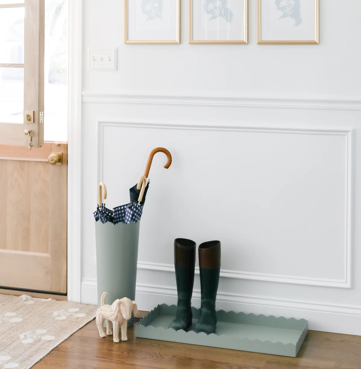 Next, rethink boot storage. Winter footwear needs airflow to dry properly, so open racks, trays, or baskets tend to work better than closed bins. A simple boot tray with raised edges helps contain melting snow, salt, and slush while protecting floors underneath. If space allows, placing the tray slightly away from the wall can also help boots dry faster.